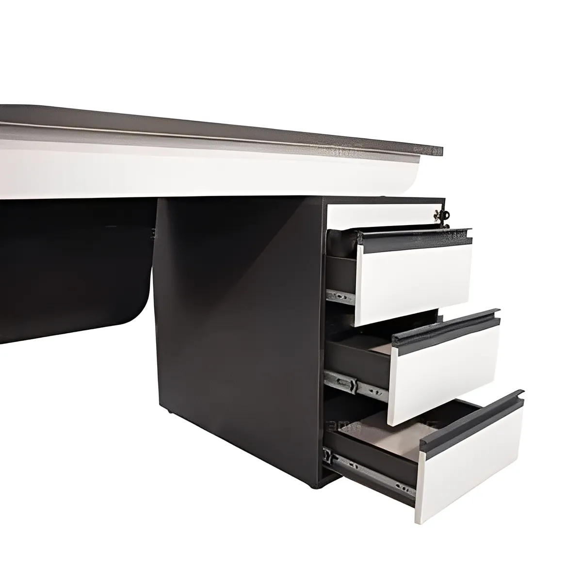 این میز مجهز به سه کشوی کاربردی است که امکان نگهداری اسناد، لوازم اداری و وسایل شخصی را به‌صورت منظم فراهم می‌کند. وجود این کشوها باعث می‌شود ابزارهای مورد نیاز همیشه در دسترس باشند و میز کار مرتب باقی بماند.
